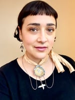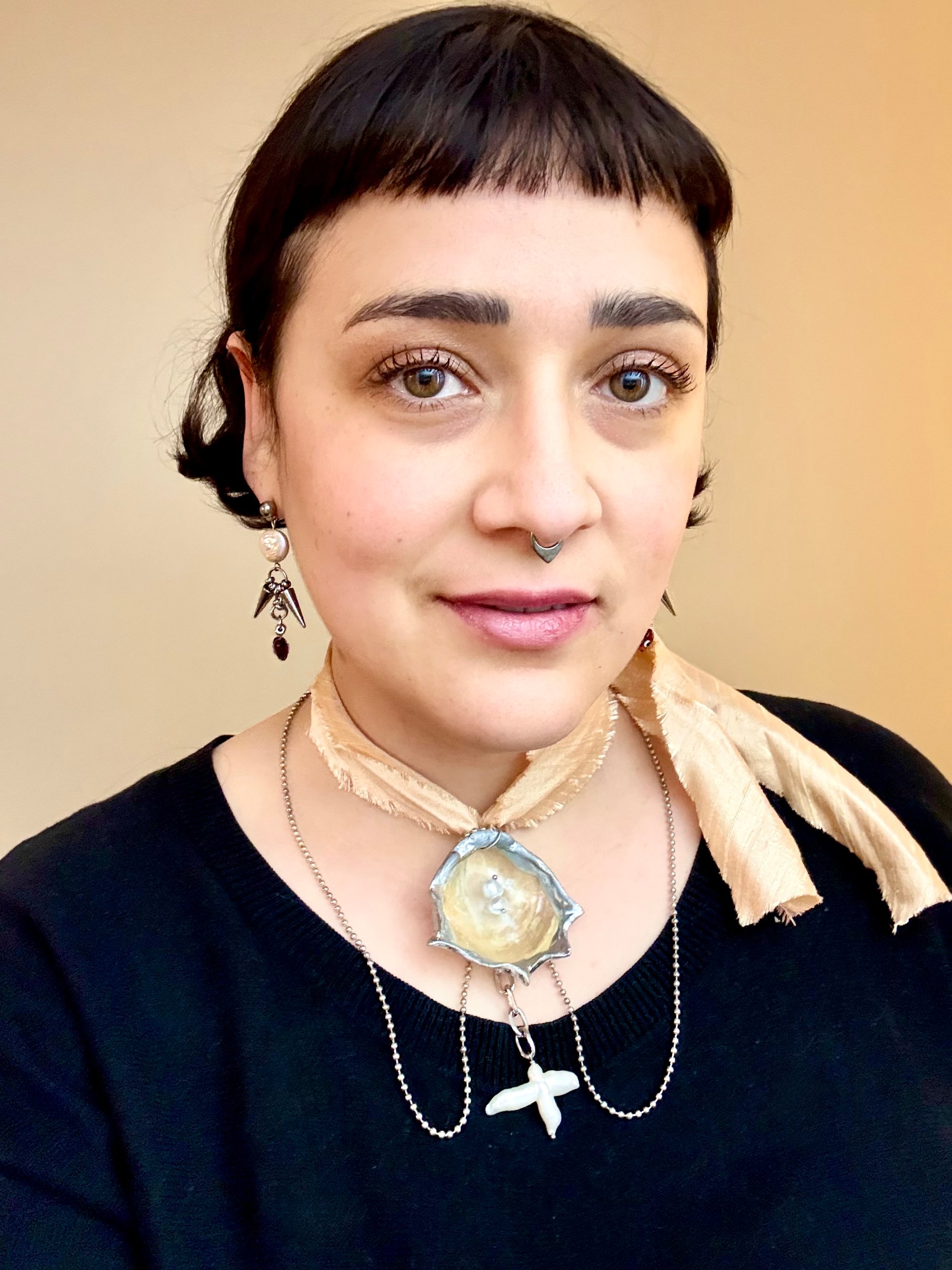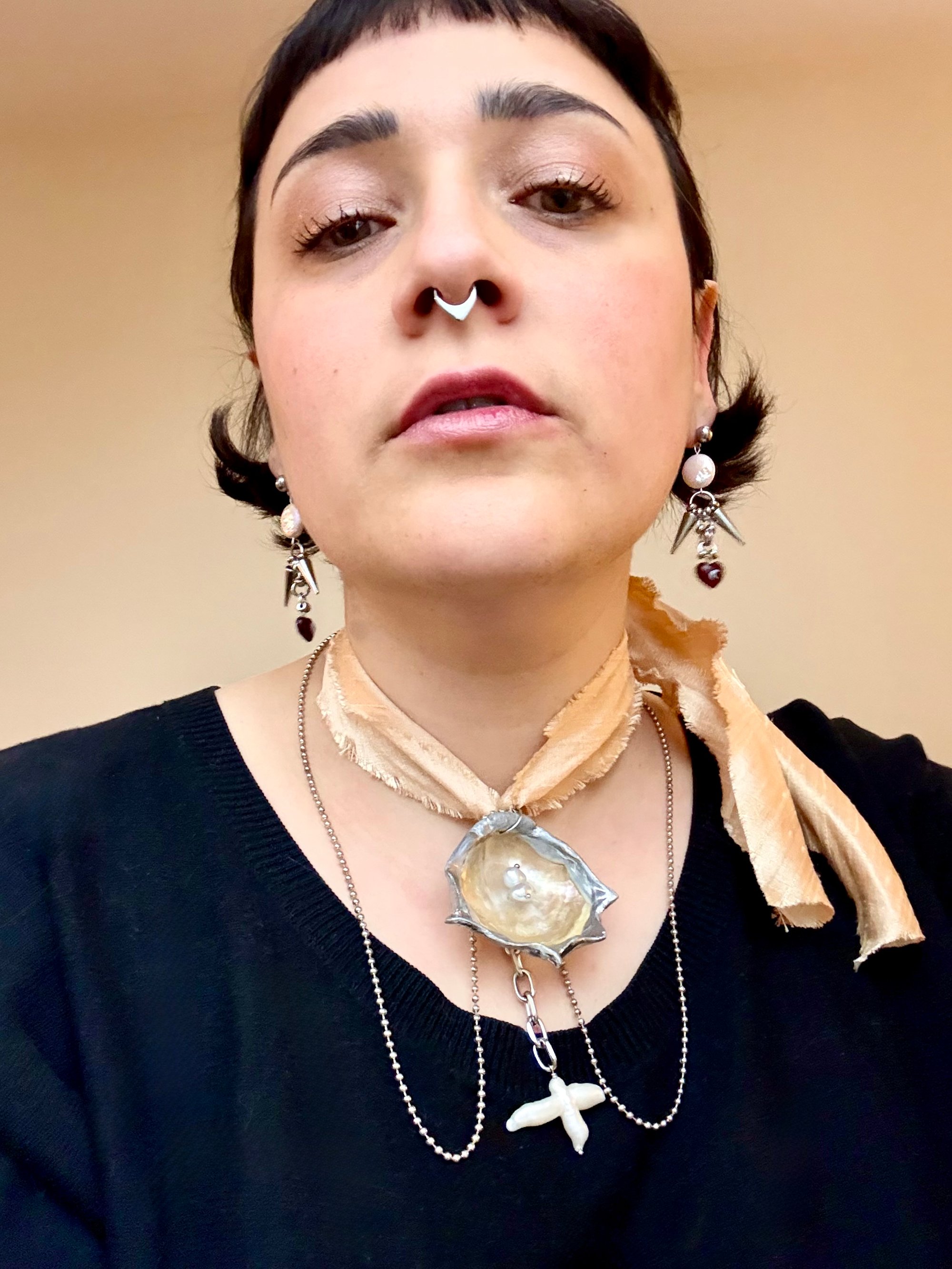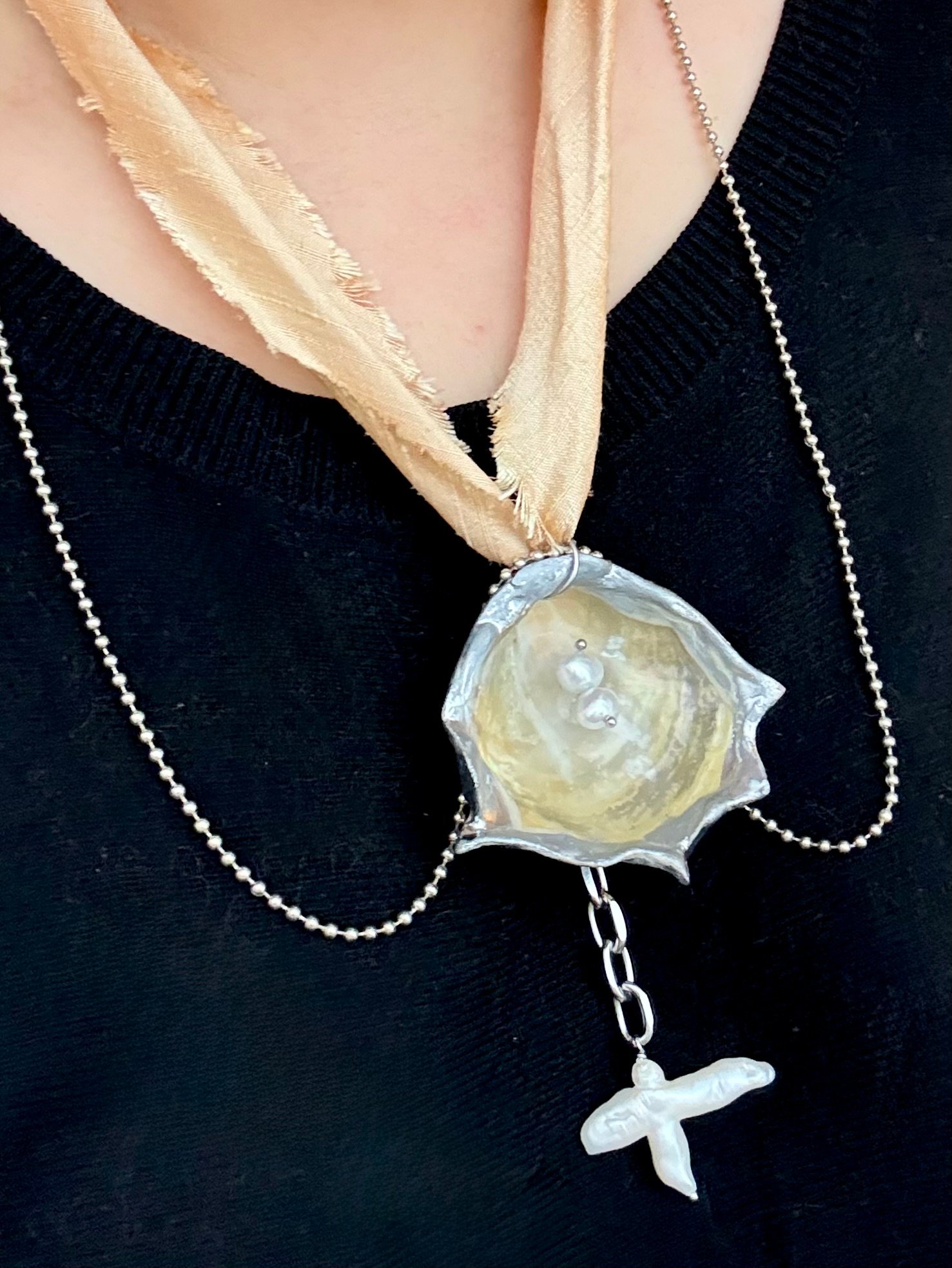 This large Jingle shell was found at a local beach. It has a sculptural frame adorned with upcycled pearls. The ball chain and vintage silk ribbon make it very versatile. It can be worn so many different ways!