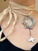 The shell is transformed into a pendant with a sculptural process & adorned with up-cycled pearls & recycled silk ribbon.