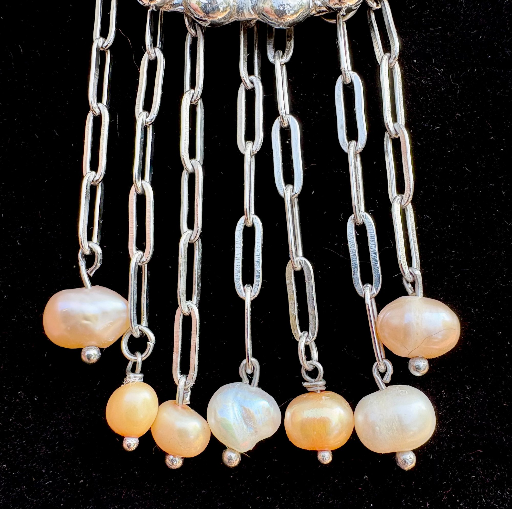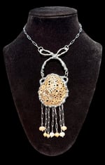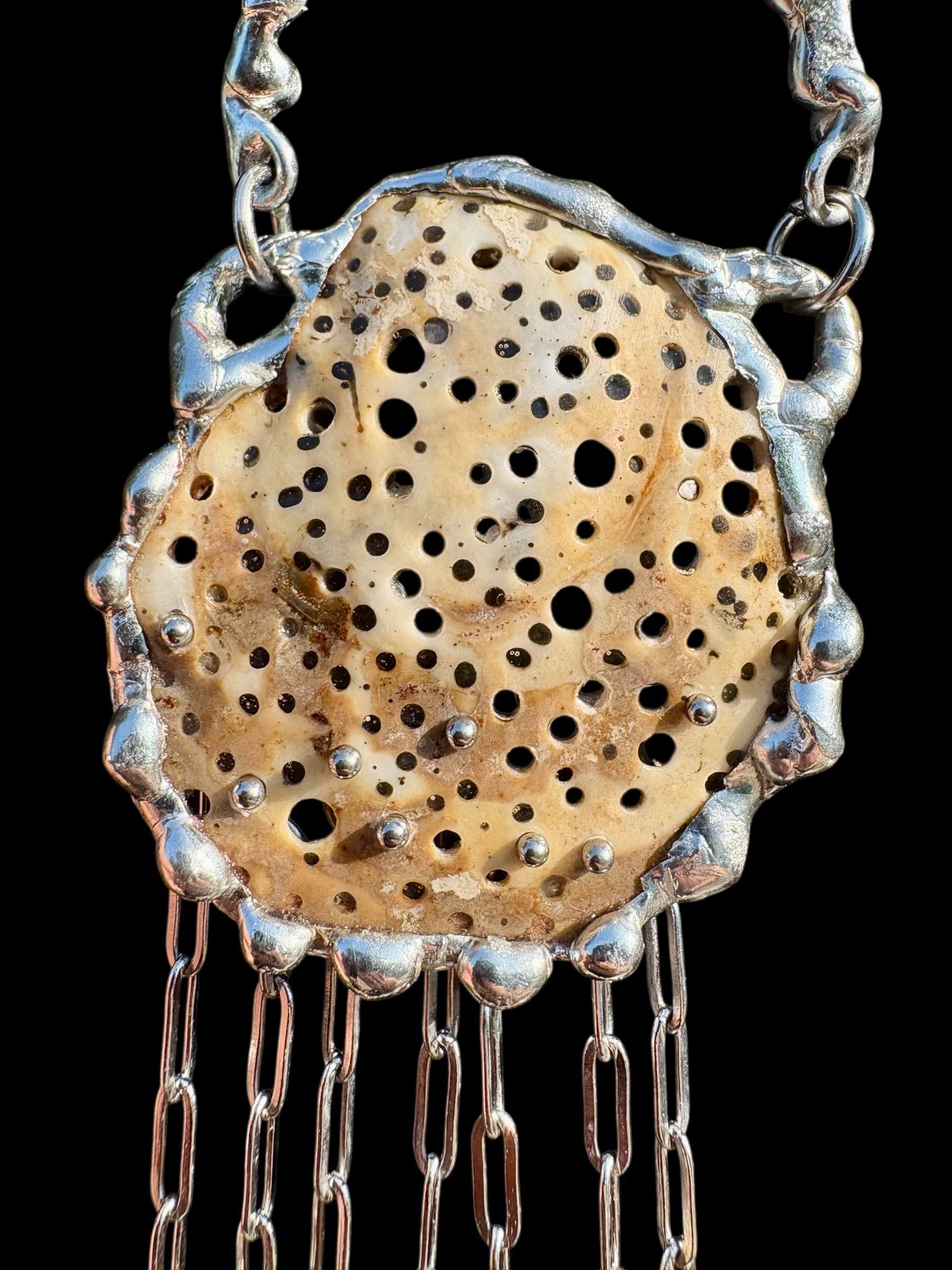Materials: found shell, tin/silver, upcycled pearls , stainless steel chain