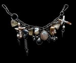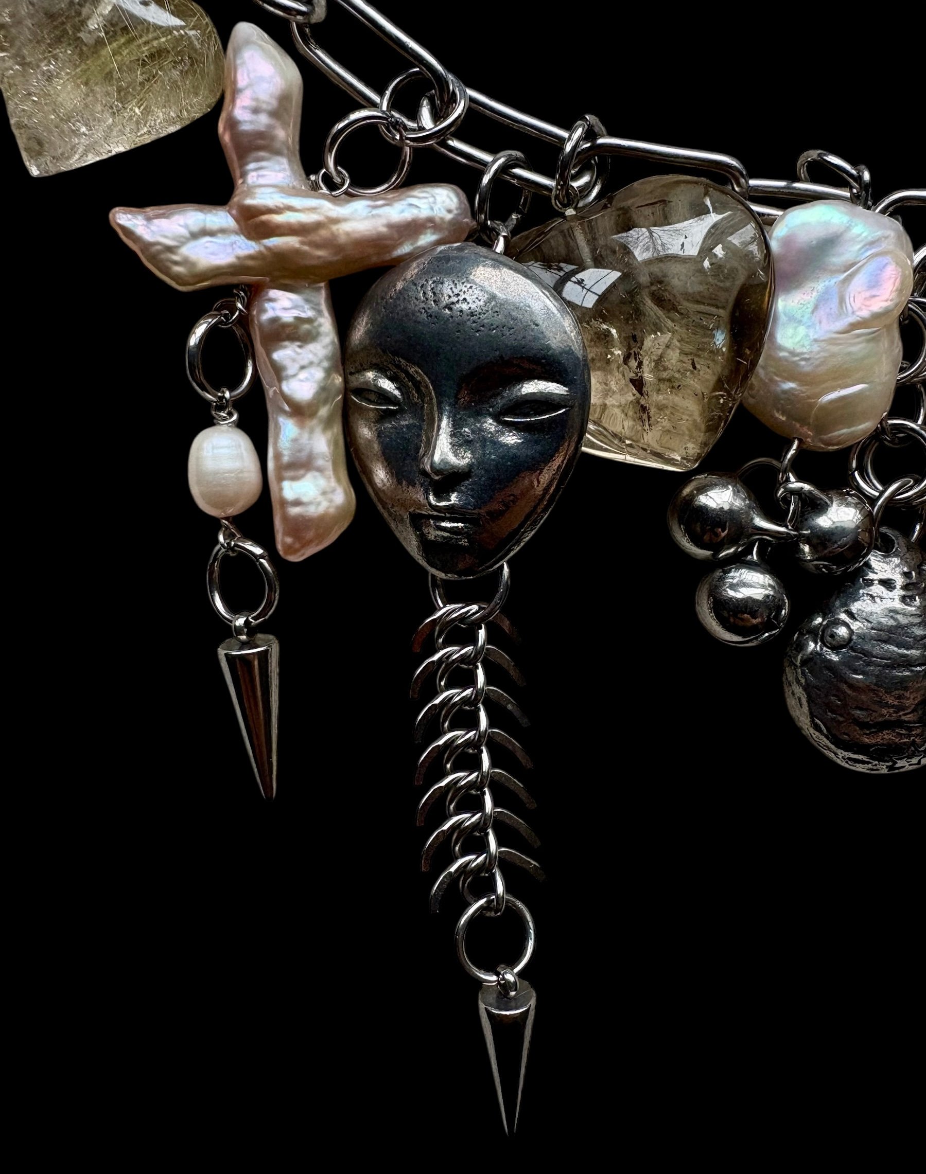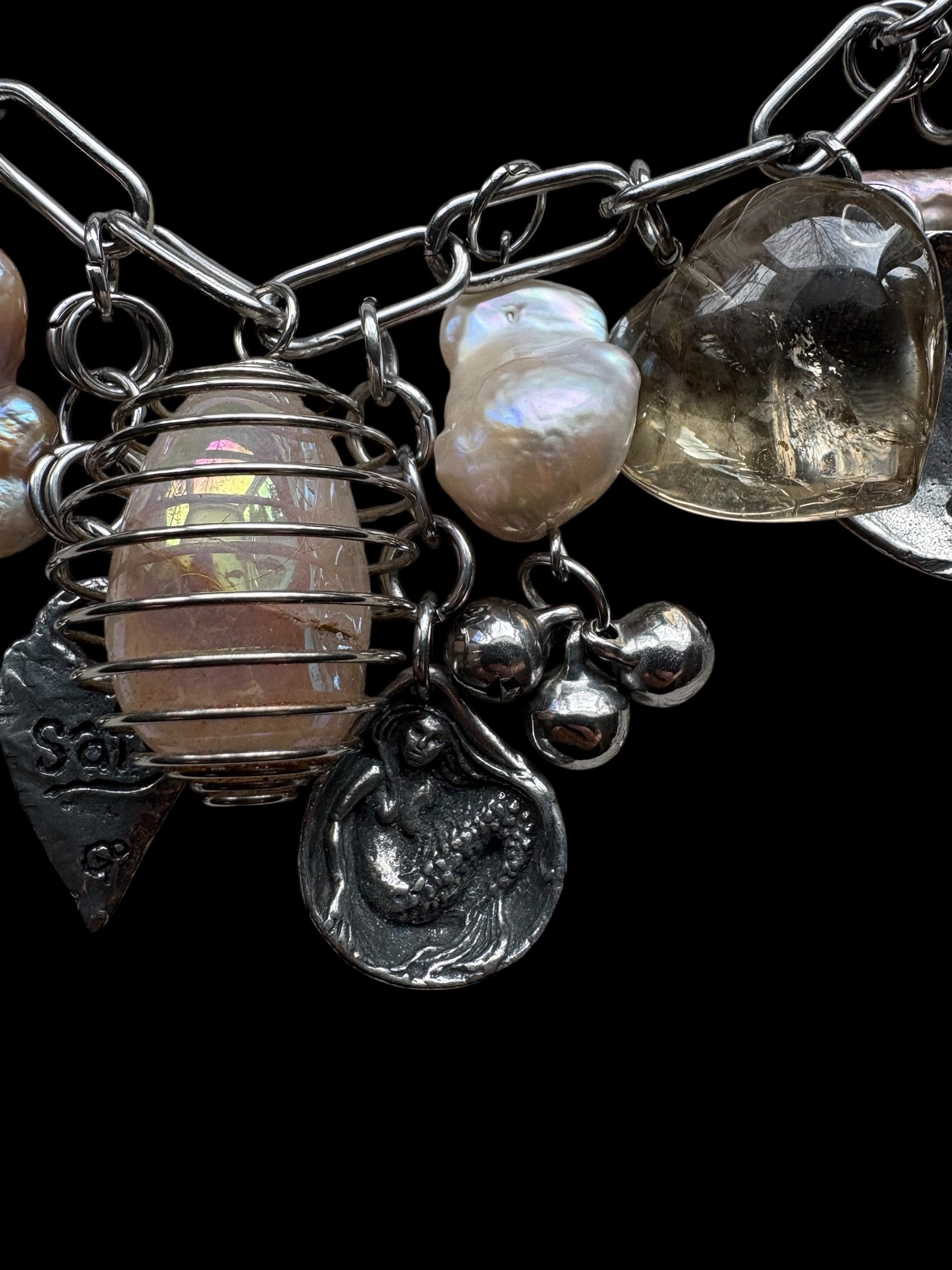 Stainless steel, pewter charms, real pearls, gemstones rose aura quartz, citrine, Smokey quartz