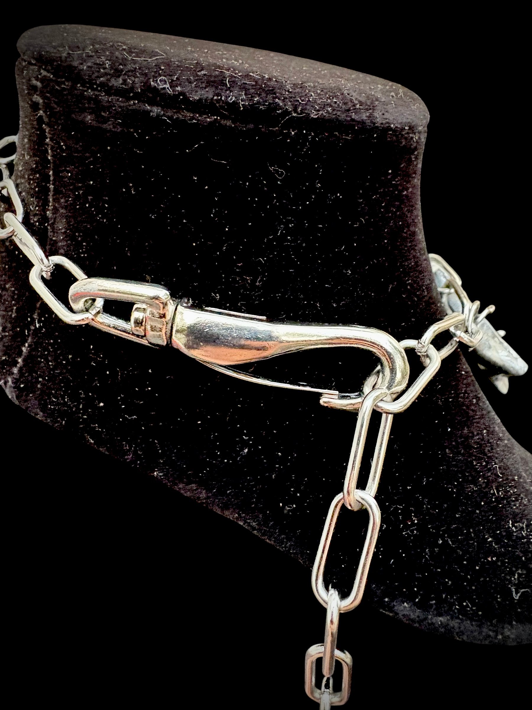 To preserve the chrome finish for as long as possible, avoid touching the metallic finish directly. (Handle the chain/clasp or tie when taking on and off.)